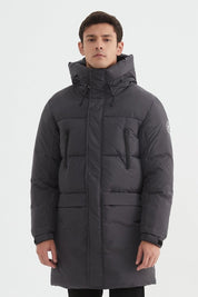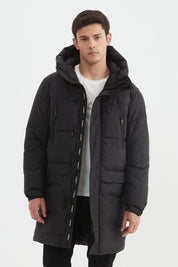 Doudoune longue uni, Capuche intégrée avec cordon de serrage ,Fermeture à glissière,4 poches zippées, Col montant, Logotype Kymaxx tout le long de la glissière en plastique, Patte de boutonnage en scratch, Tissu déperlant "Water Repellent Technology".