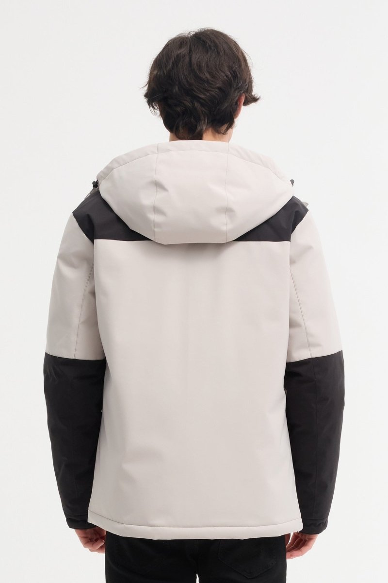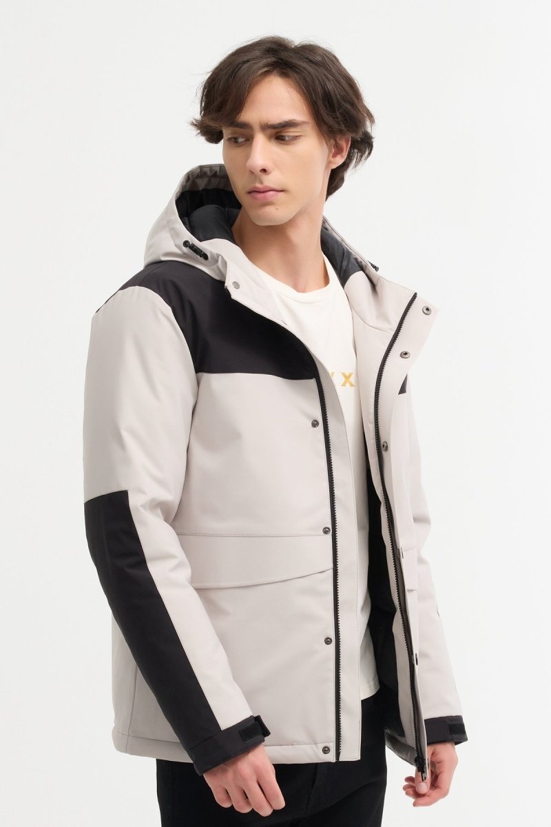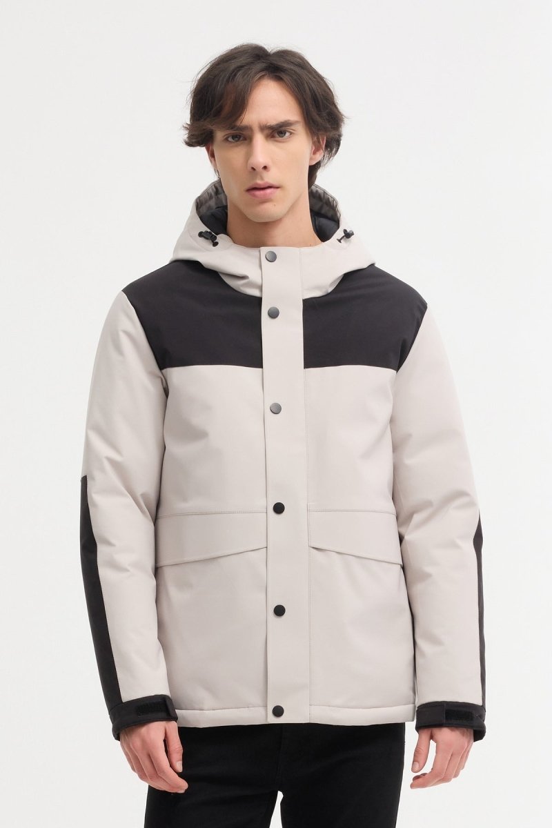 Découvrez notre doudoune bicolore ECRU et noire, Sa capuche fixe avec cordon de serrage assure une protection efficace contre le froid et le vent. La fermeture zippée avec rabat à boutons pression offre une isolation optimale.