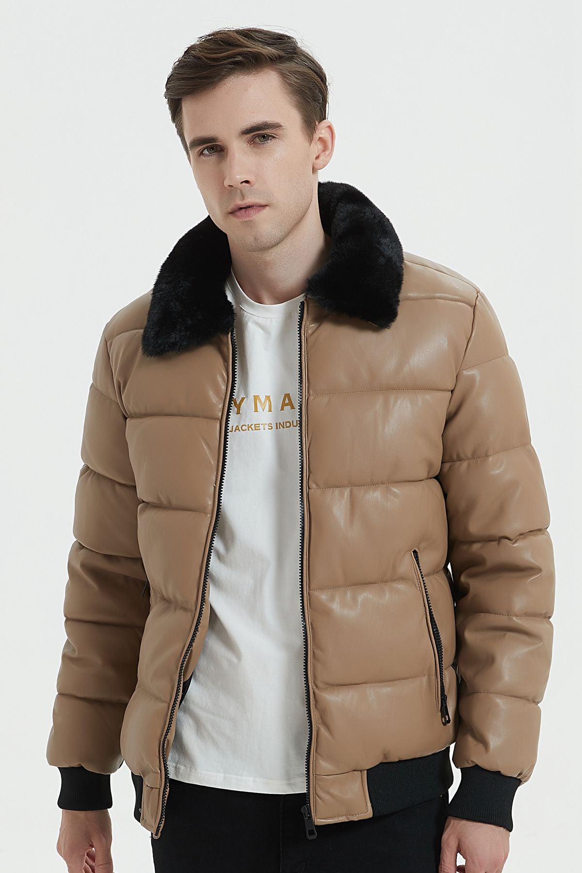 Doudoune d'hiver similicuir. Large col à fausse fourrure amovible. Col teddy(sans fourrure). Modèle court et bouffant style blouson, Boucle de fermeture de bouton à pression au col. Tissu matelassé avec bandes moyennes, Tissu déperlant "Water Repellent", 2 poches zippées sur les côtés. Logotype sur l'épaule gauche. Doublure simple. Une poche intérieur à zip.
