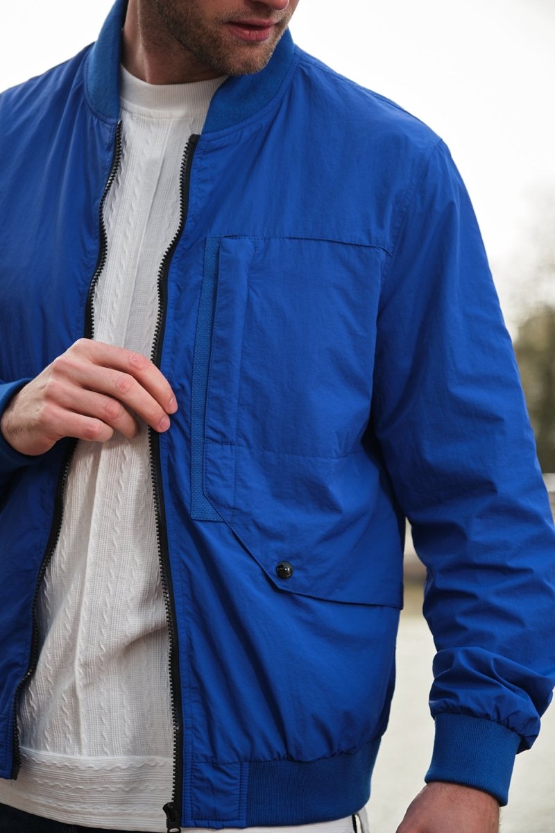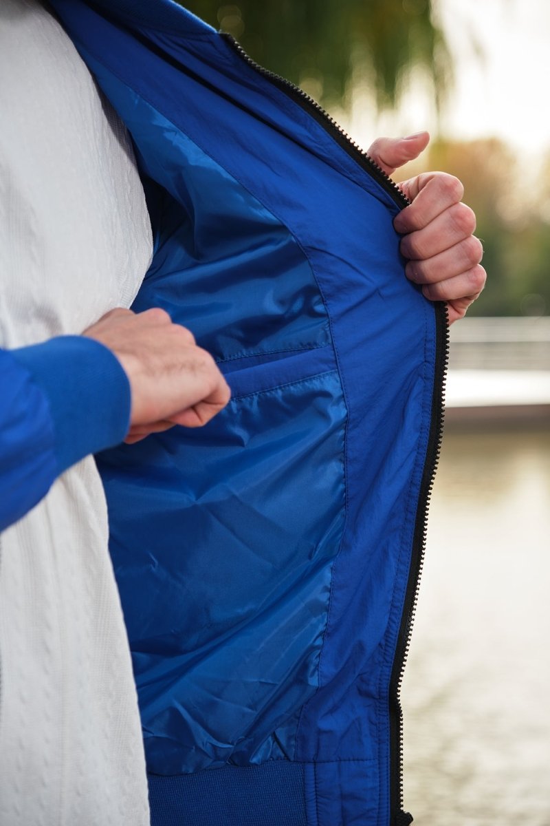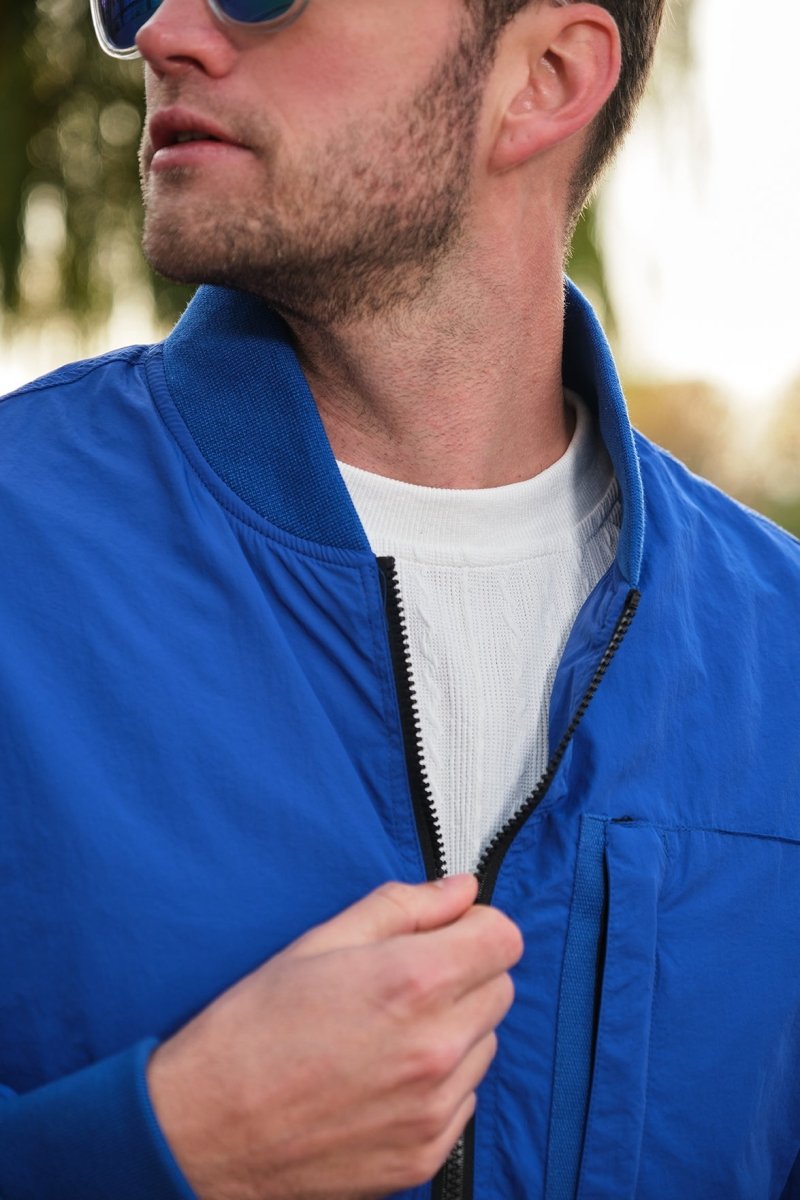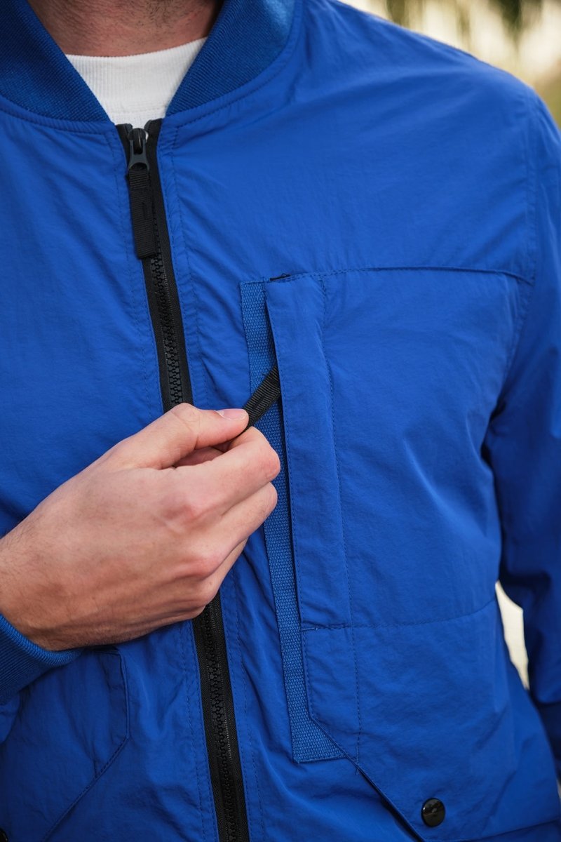 Veste mi-saison homme. Coupe courte ajustée. Tissu déperlant et matière douce. Petit col teddy. Élastiques taille et poignets assortis. Fermeture à glissière en plastique. Deux poches sur les côtés à bouton de pression. une poche à zip sur torse, une poche intérieur au niveau de la torse sans fermeture.
