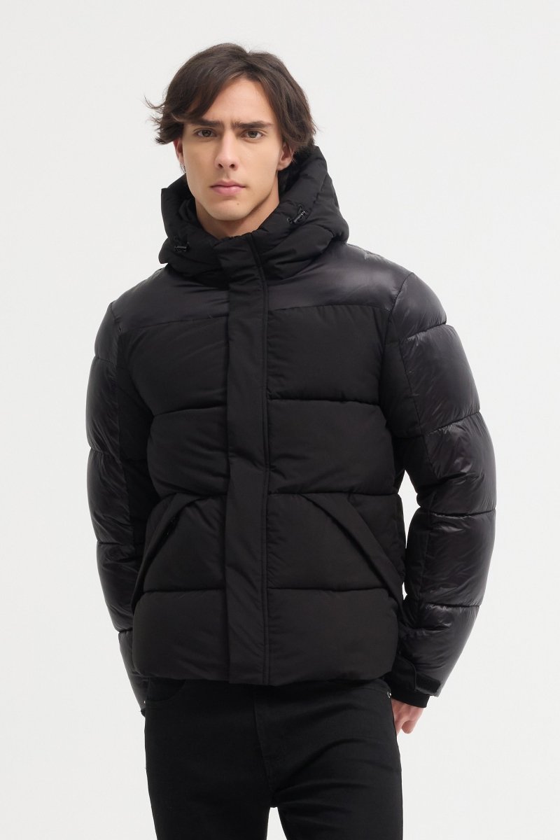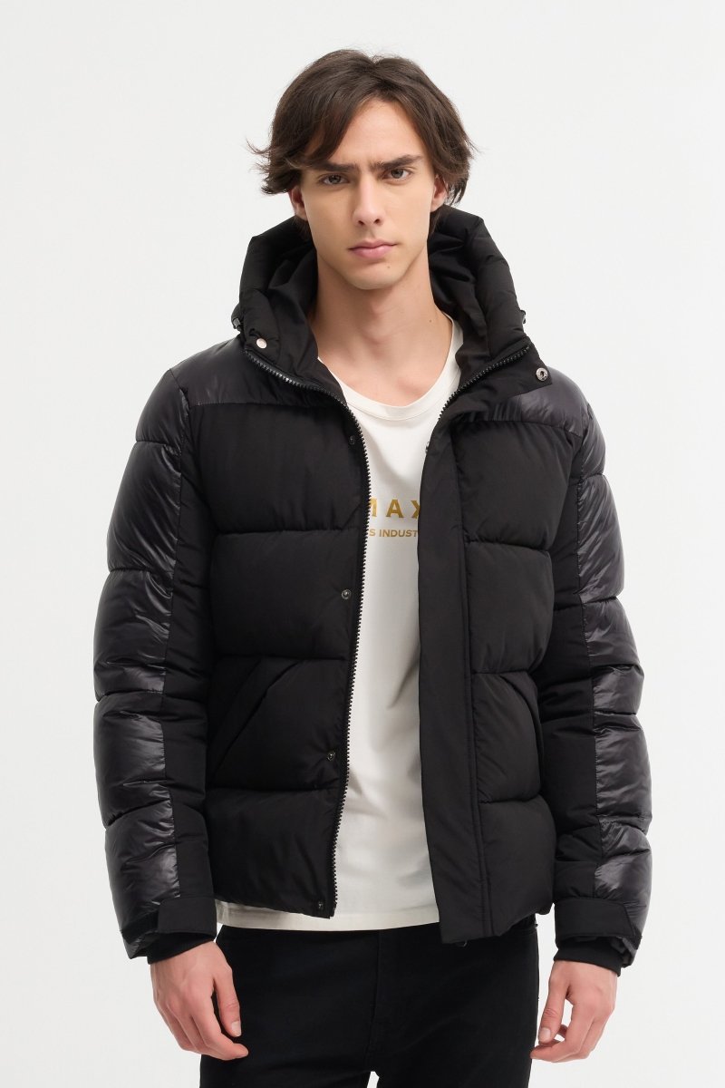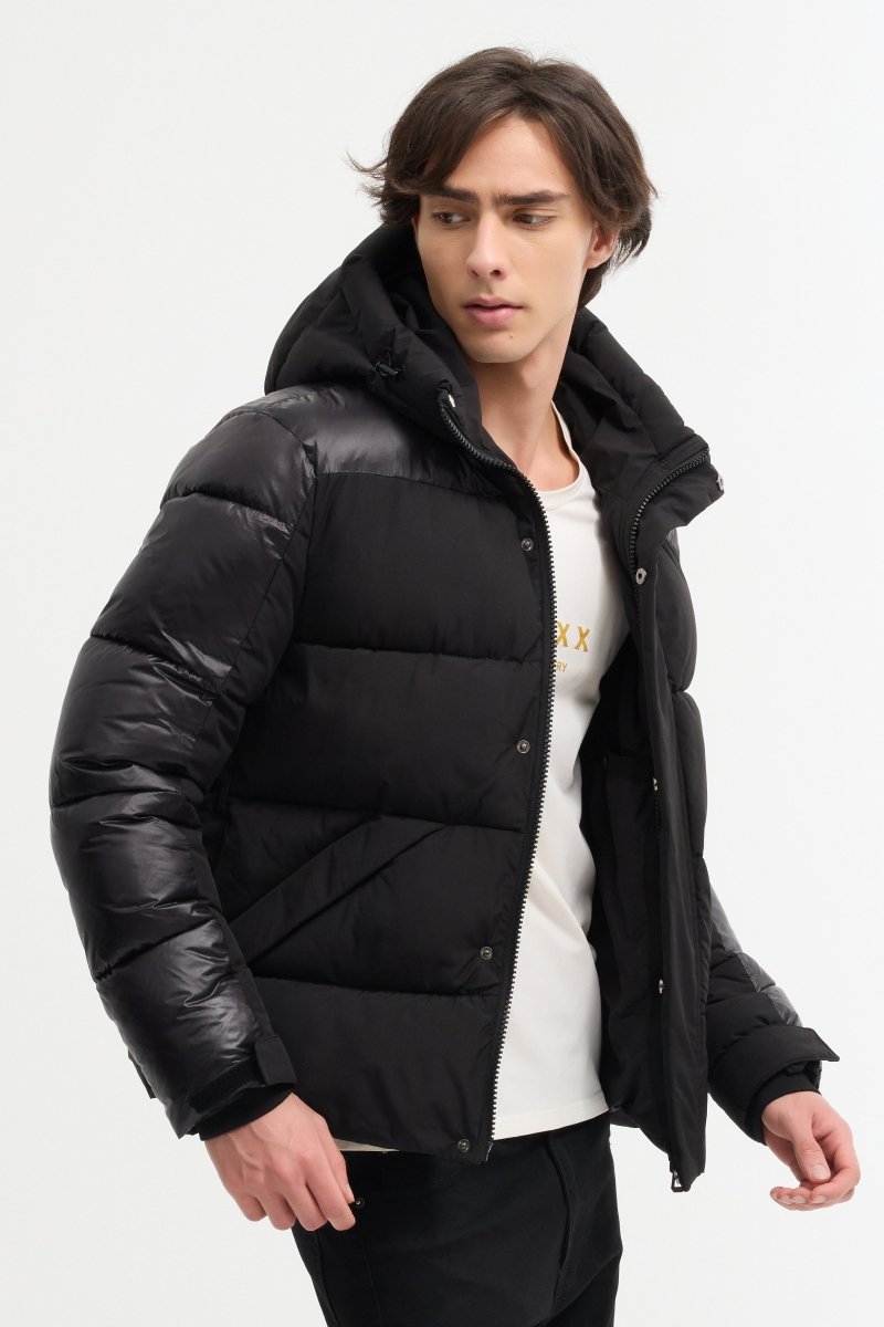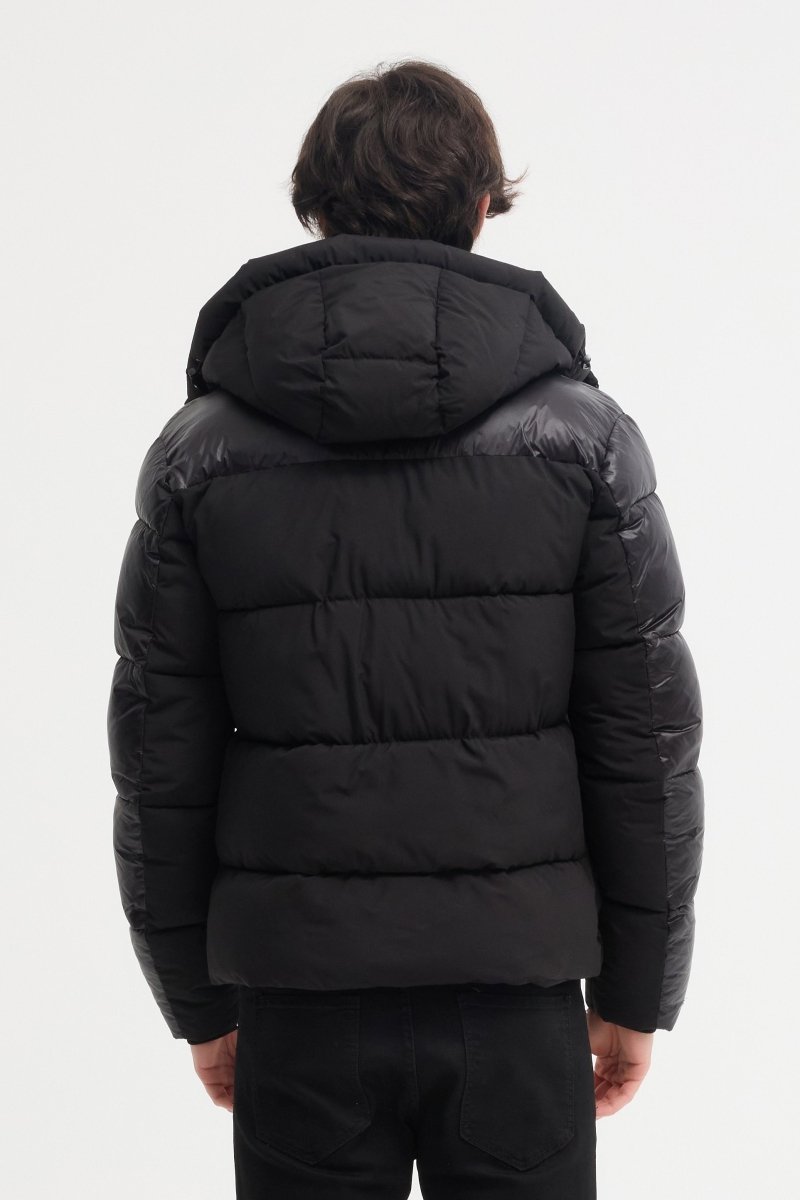 Doudoune noire matelassée avec capuche intégrée. Manches et épaules en tissu contrastant légèrement brillant. Fermeture zippée avec rabat à pressions sur le devant. Deux poches latérales pratiques. Poignets avec bande réglable velcro. Coupe droite et confortable pour un usage quotidien.